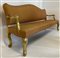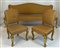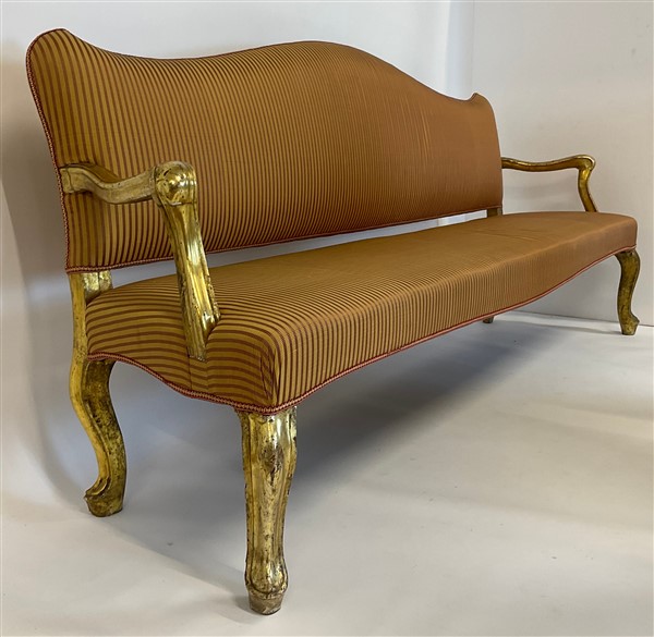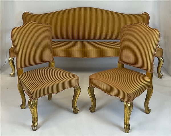 Fornitura da salotto composta da divano e coppia di sedie in legno intagliato e dorato a mecca con braccioli e gambe mosse. Secolo XIX (L. max cm 225) (difetti)