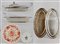 Lotto composto da un piattino in porcellana decorato in policromia con soggetto ornitologico profilato in oro (Meissen), un piatto inglese in ceramica con decoro orientale, due pesciere e due portavivande in metallo argentato e vetro (misure diverse) (difetti)