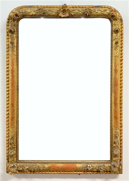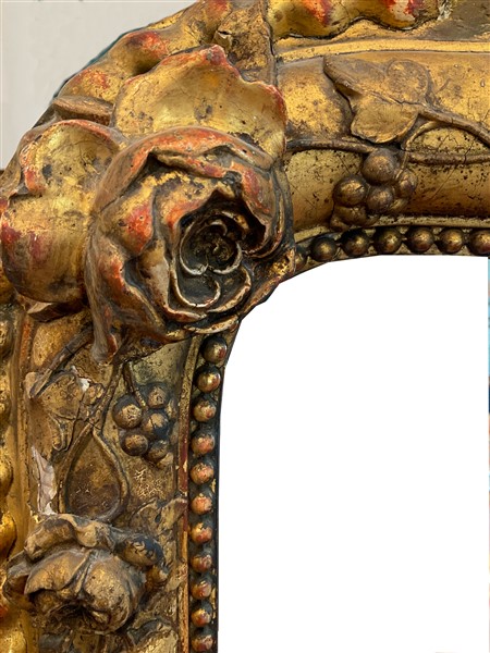 Caminiera in legno e stucco dorato con decori a fiori in rilievo e bordura perlinata. Secolo XIX (cm 127x90) (difetti e restauri)