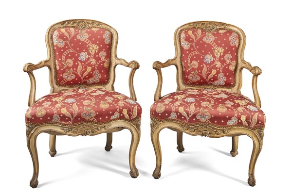 Coppia di poltrone in legno intagliato e laccato, seduta e schienale rivestiti in tessuto policromo. Secolo XVIII (difetti)