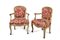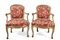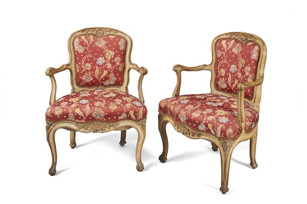 Pair of 18th-century carved and lacquered wooden armchairs, seat and back covered in polychrome fabric (defects)