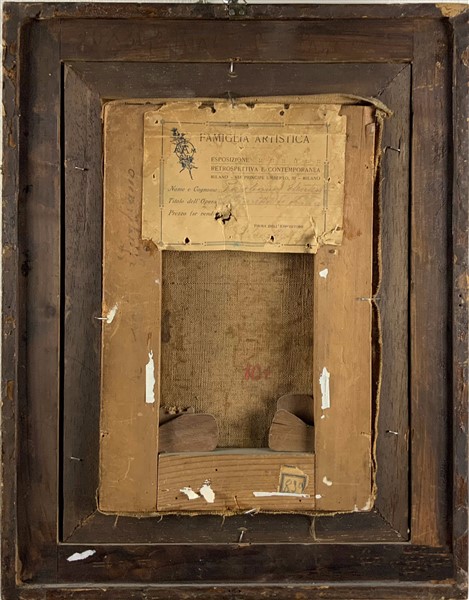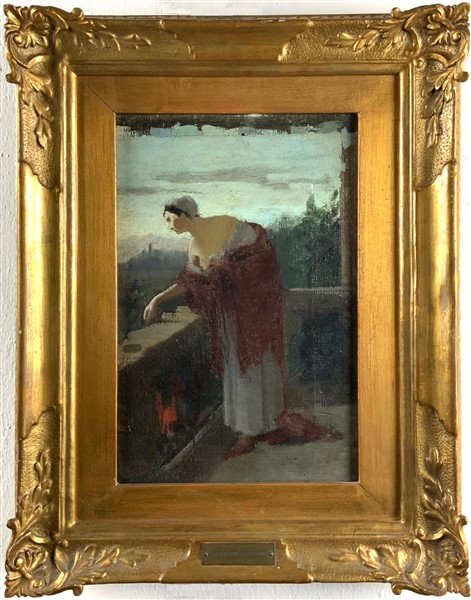 Eleuterio Pagliano "Bozzetto per figura femminile al balcone" olio su tela (cm