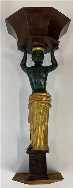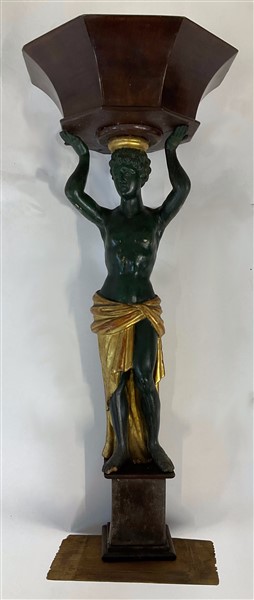Alzata con sostegno in legno intagliato, dipinto e dorato, a figura femminile su base a plinto reggente coppa ottagonale. Secolo XIX (h cm 58) (difetti, restauri e piccole mancanze)