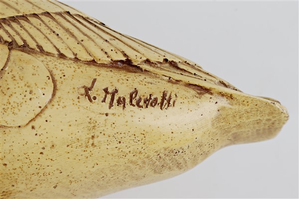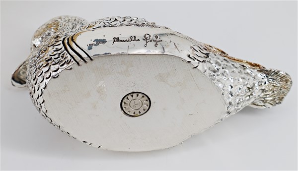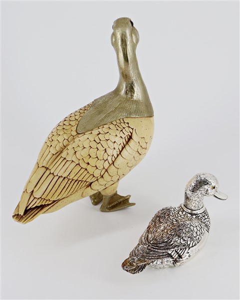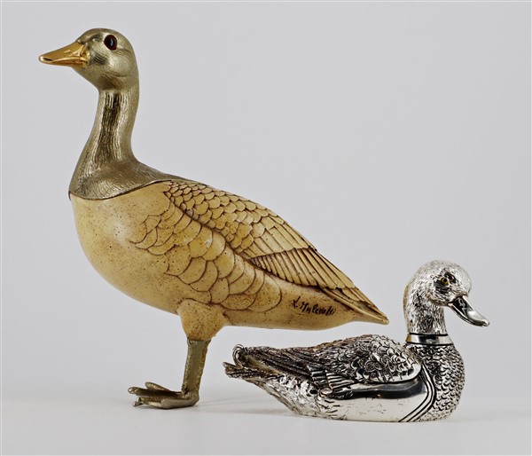 Lotto composto da due figure di papere, di cui una in metallo argentato ed altri materiali firmata L. Malevolti e una laminata in argento firmata Marcello Giorgio (difetti)