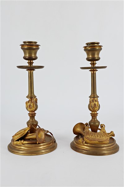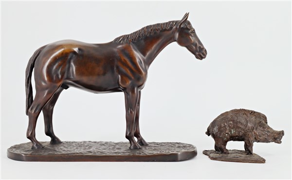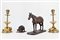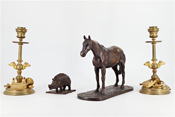 Lotto composto da due sculture in bronzo raffiguranti un cavallo firmato Pitou (h cm 19) ed un cinghiale (h cm 6), uniti ad una coppia di candelieri in metallo a soggetto venatorio (h cm 22) (lievi difetti)