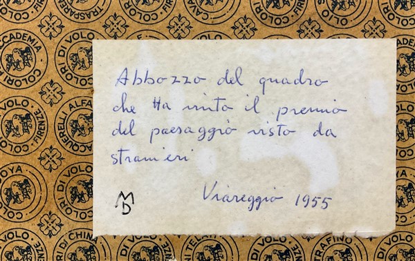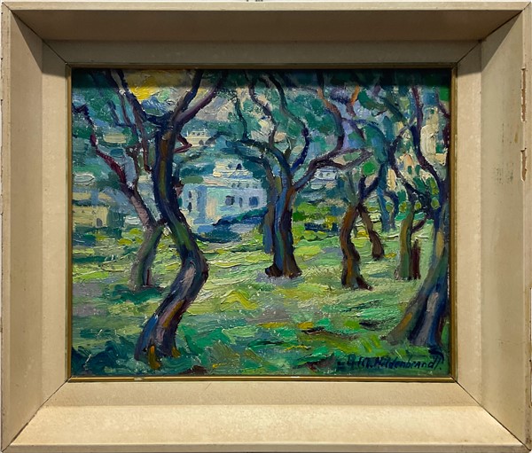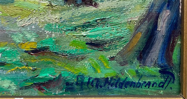 "Paesaggio con alberi" olio su cartone telato (cm 24x29) firmato in basso a destra A.M. Hildenbrandt, cartiglio al retro