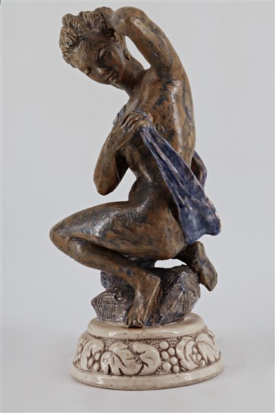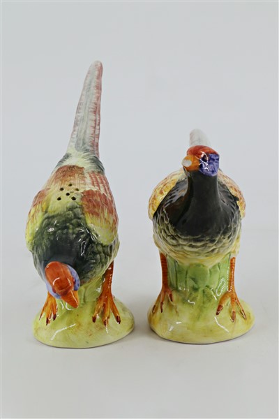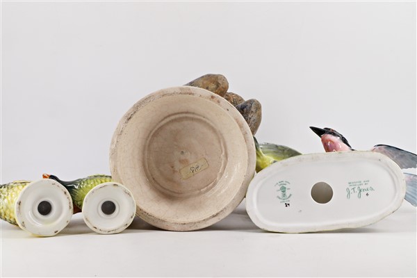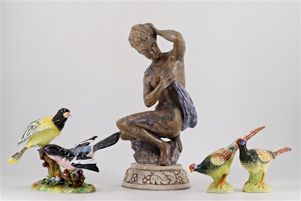 Lotto composto da un gruppo in porcellana raffigurante uccelli, marcato Crown Staffordshire J.T. Jones, una coppia di fagiani sale/pepe in ceramica policroma, ed una scultura in ceramica raffigurante una bagnante (h max cm 34) (difetti)