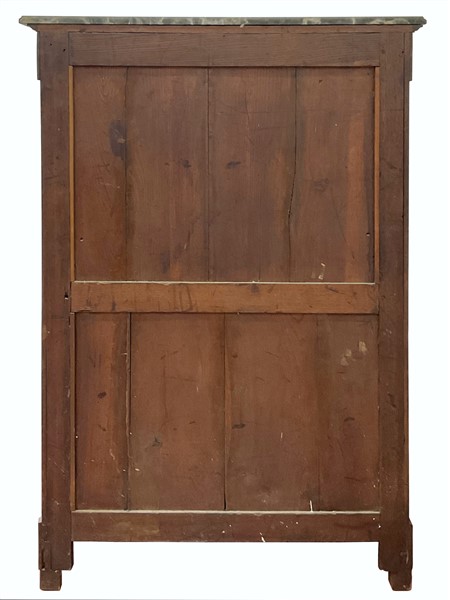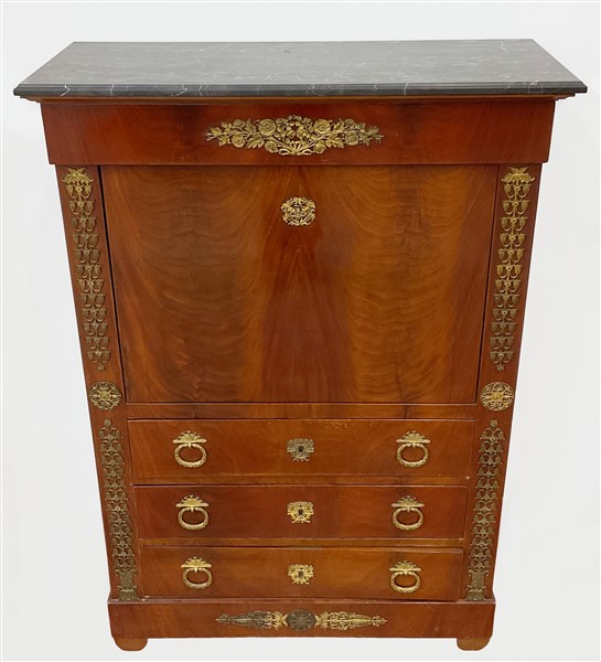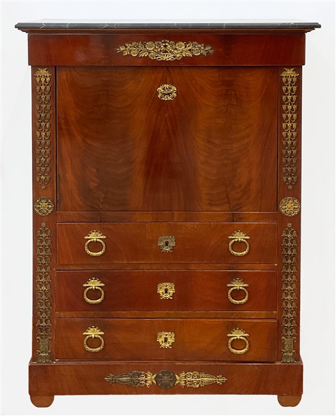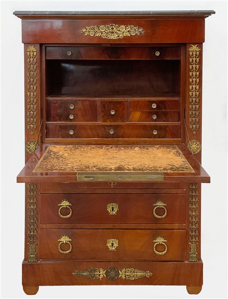 Secretaire impiallacciato in piuma di mogano con fronte a quattro cassetti, calatoia celante pianetto in pelle impressa, sei cassetti e vano a giorno, fregi, bocchette e maniglie in bronzo dorato. Piano in marmo cipollino. Secolo XIX (cm 98x138x40) (difetti)