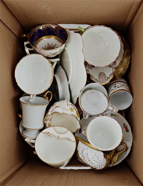 Manifatture differenti. Lotto composto da numerose tazzine con piattini in porcellana dipinta in policromia con decori differenti. In un cartone (difetti)