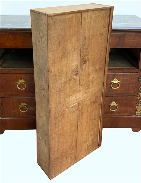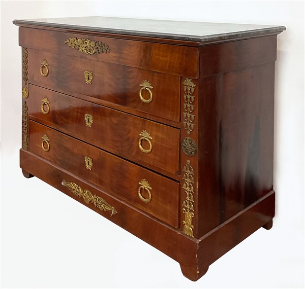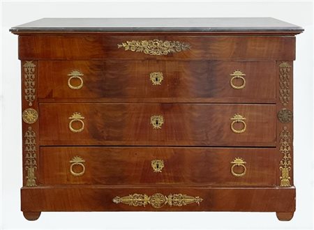 Cassettone impiallacciato in piuma di mogano con fronte a tre cassetti, fregi, bocchette e maniglie in bronzo dorato. Piano in marmo cipollino. Secolo XIX (cm 128x91x55) (difetti)