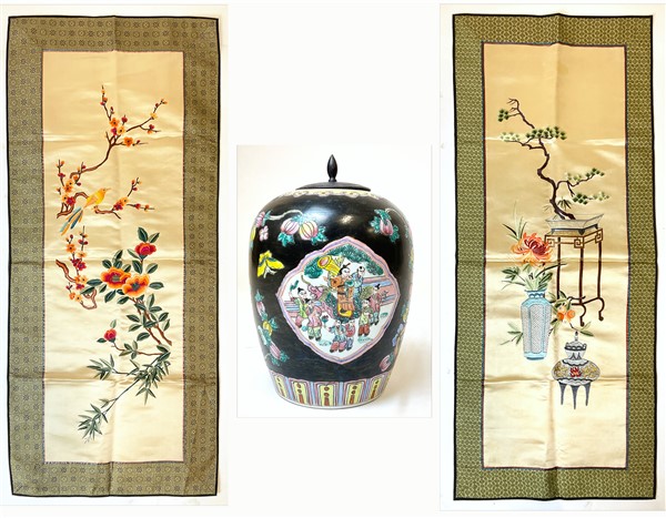 Lotto composto di due tessuti in seta ricamati e una potiche in porcellana policroma Famiglia Nera con coperchio in legno