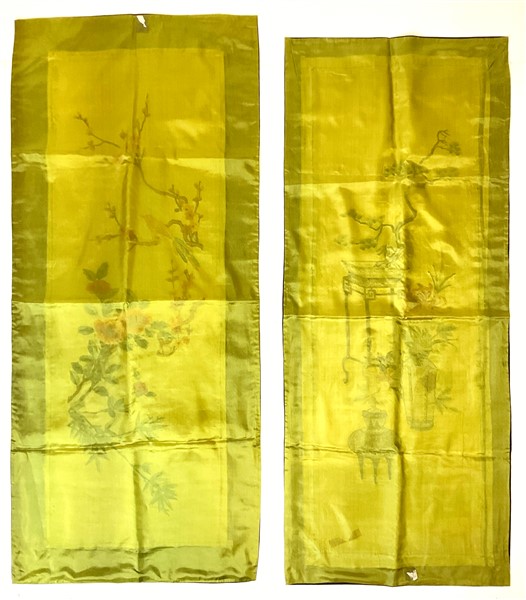 Lotto composto di due tessuti in seta ricamati e una potiche in porcellana poli