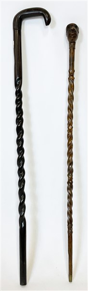 Lotto composto da due bastoni da passeggio in legni diversi intagliati, di cui