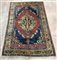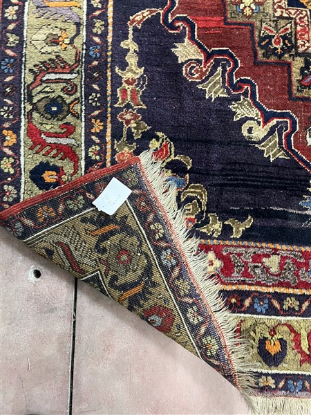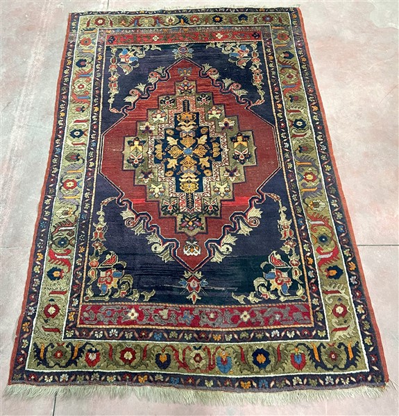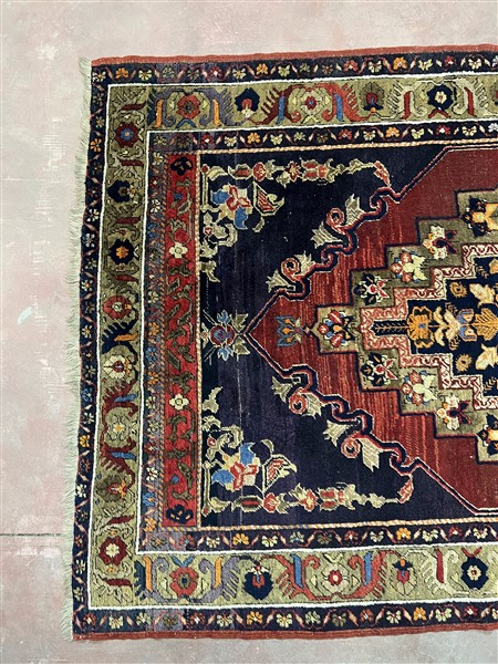 Tappeto Yoruk, Anatolia, secolo XX. Decoro con medaglione romboidale stilizzato nei toni del blu e senape su fondo rosso. Angolari color melanzana (cm 176x118) (lievi difetti e rapature)