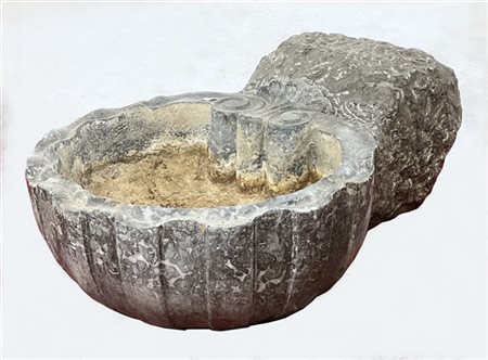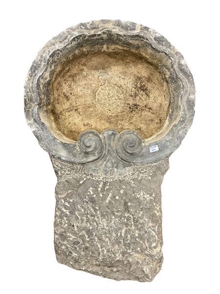 Acquasantiera in marmo grigio con coppa a valva di conchiglia (cm 64x44) (difetti)