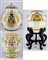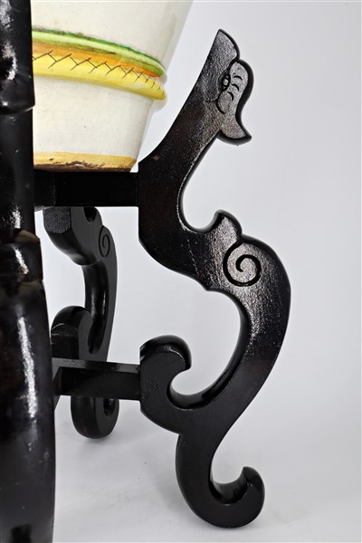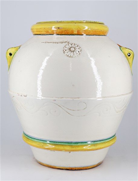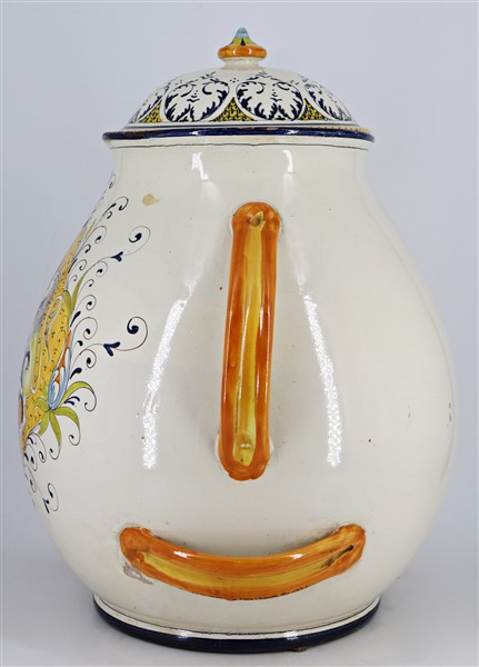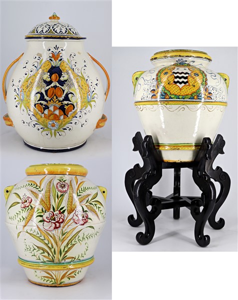Manifatture differenti. Lotto composto da due giare e un vaso con coperchio in ceramica dipinta in policromia con decori diversi, una poggiante su base adattata in legno intagliato (h. max cm 58) (difetti)