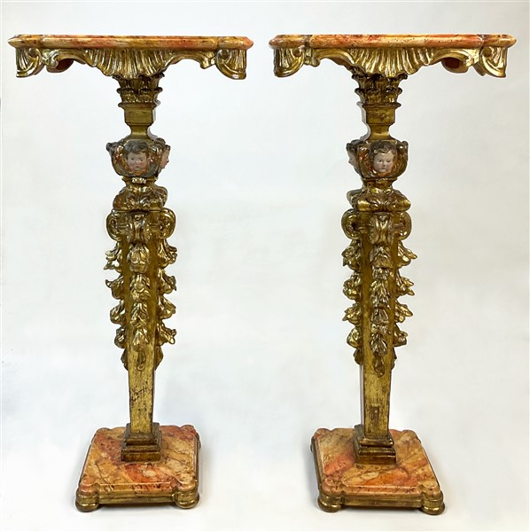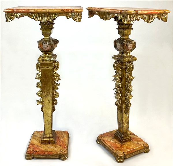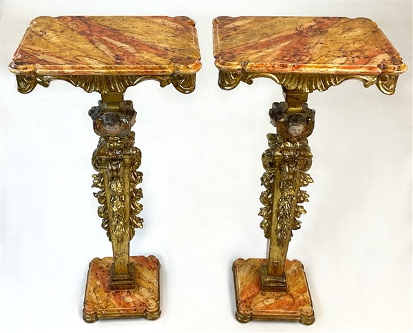 Coppia di gueridon in legno intagliato, dipinto e dorato con antichi sostegni scolpiti a teste d'angelo e volute fogliacee. Piani e basi sagomate a finto marmo d'epoca successiva (cm 40x84x30) (difetti)