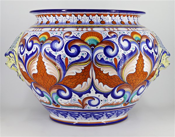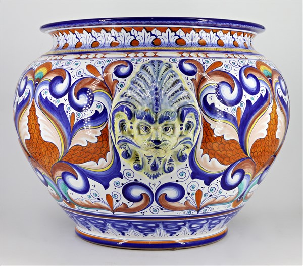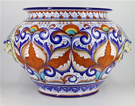 Manifattura La Vecchia Faenza, secolo XX. Grande cache-pot in ceramica decorata in policromia con anse a mascheroni. Marca sul fondo (h. cm 39, l. cm 57) (lievi difetti)