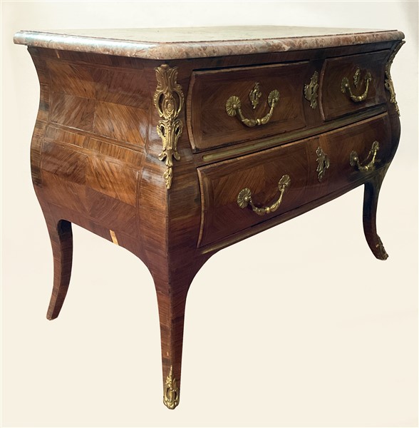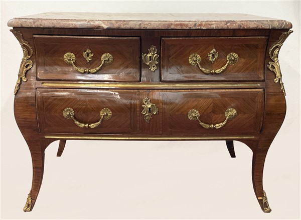Antico cassettone di forma mossa ad un cassetto e due cassettini lastronato in bois de rose e filettato in metallo dorato, fregi in bronzo dorato, piano in marmo non pertinente (cm 99x75x52) (difetti)