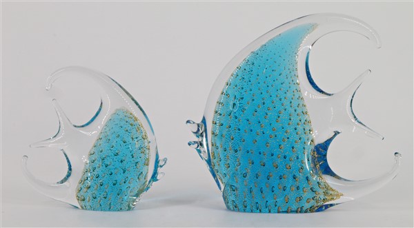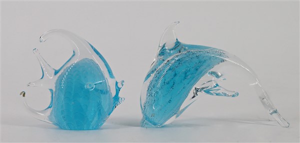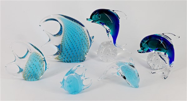 Lotto composto da sei figure di pesci e delfini in vetro policromo (h max cm 17) (difetti)