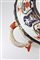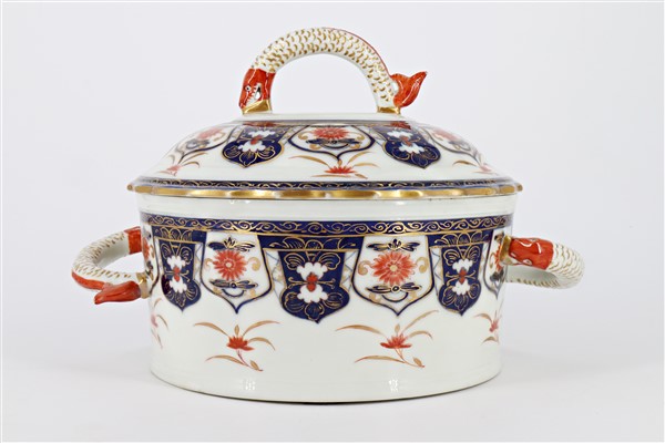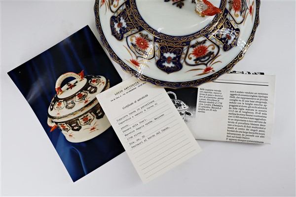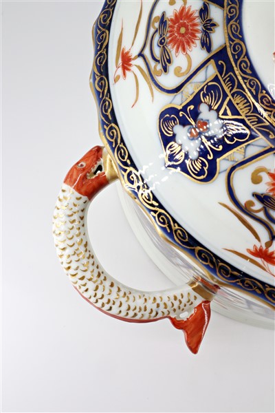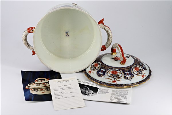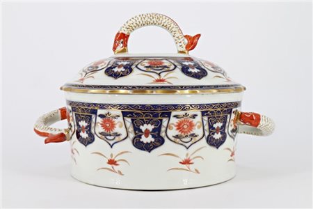 Manifattura del secolo XIX. Zuppiera biansata con coperchio in porcellana dipinta in policromia con decoro Imari profili in oro, anse in forma di drago marino (cm 29x23) (difetti e restauri)