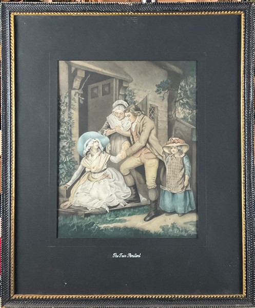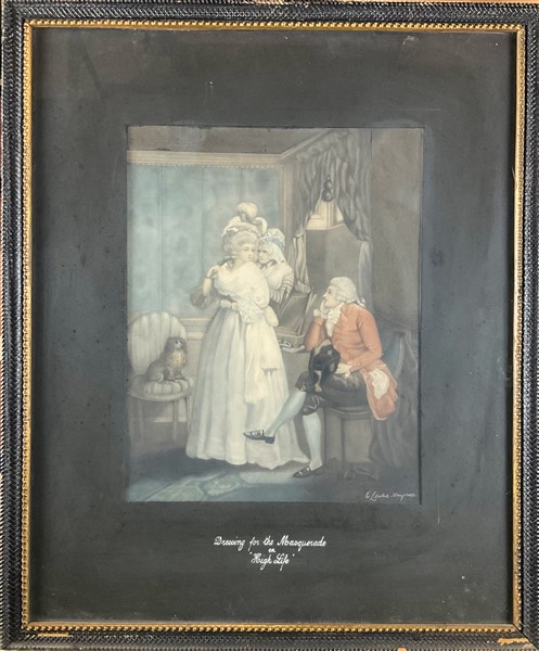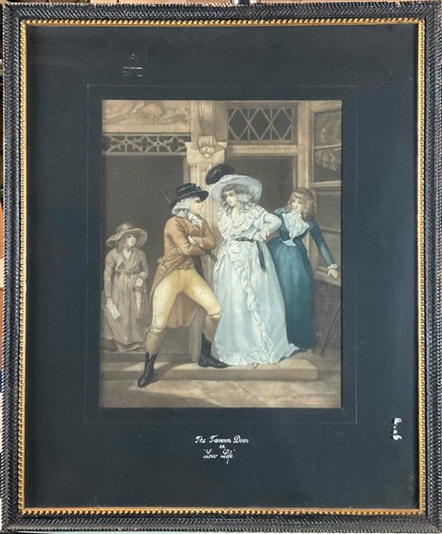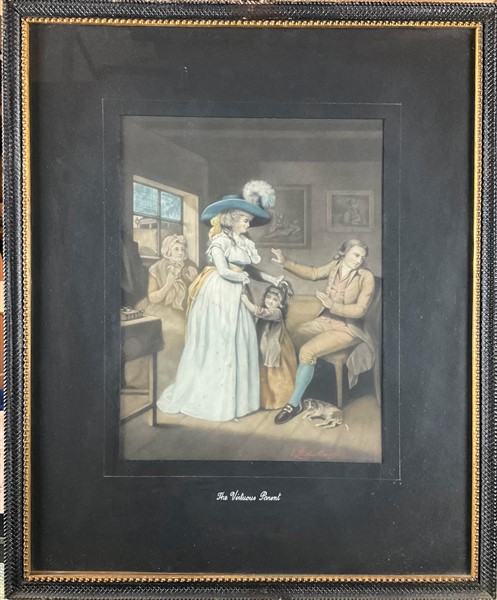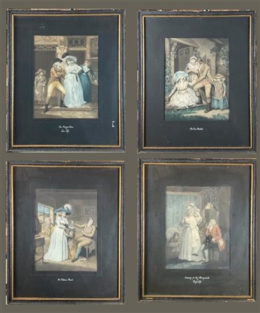 Firma indecifrata, secolo XIX. Gruppo di sei incisioni a colori titolate sul passepartout raffiguranti scene di vita vittoriana. In cornici (difetti)