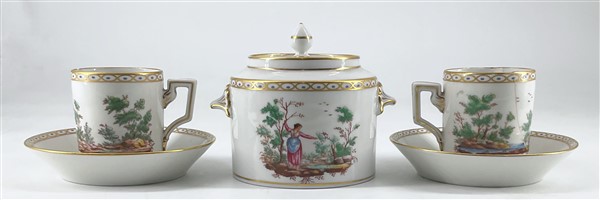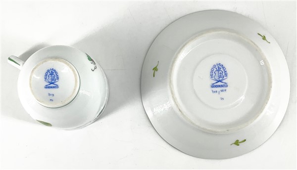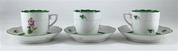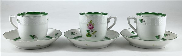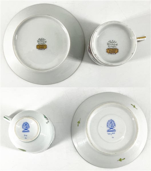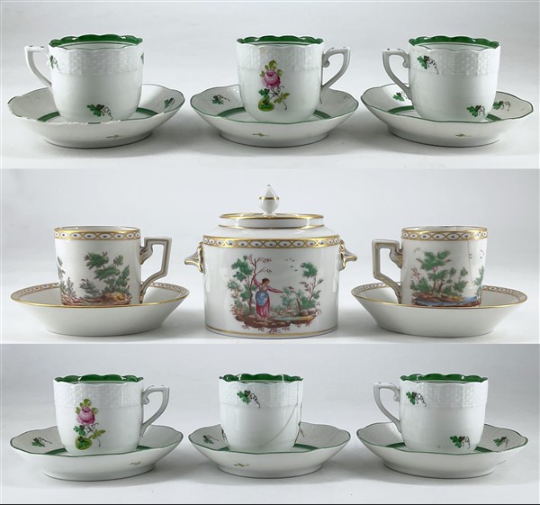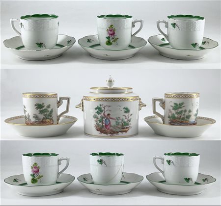 Manifatture diverse. Lotto composto da sei tazze con piatto in porcellana decorate in policromia a fiori (Herend) e coppia di tazze con piatto e zuccheriera con coperchio in porcellana decorata a paesetti (Richard Ginori) (difetti e restauri)