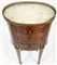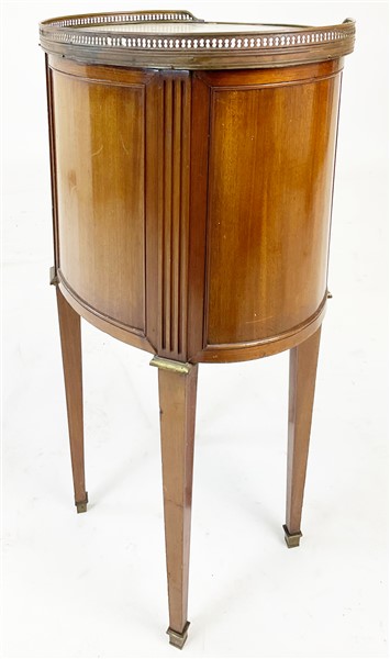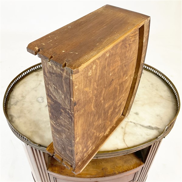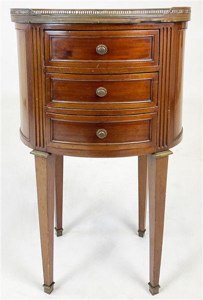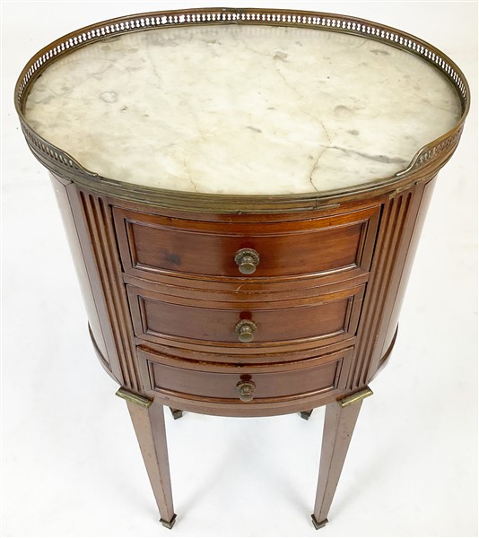 Mobiletto da centro di forma ovale a tre cassetti con gambe ad obelisco rovesciato, piano in marmo incassato, ringhierina in metallo traforato (cm 47x83x36) (difetti)