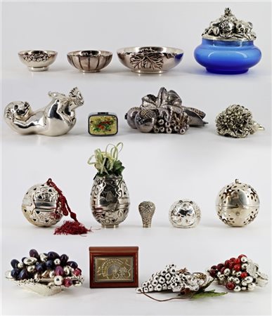 Lotto composto da numerosi oggetti in metallo argentato. In un cartone (difetti)
