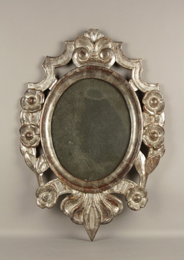 Specchierina in legno intagliato e argentato a foglia. Inizi XIX secolo. Mis. Lung. cm. 38 Alt. cm. 53 ca.