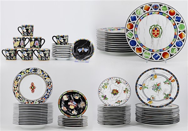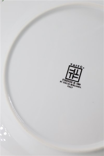 Manifattura Taitù by Emilio Bergamin, Firenze. Lotto composto da parti di servizi da tavola di diverso decoro, tra cui dodici sottopiatti, undici piatti piani, quindici fondine, quattordici piatti da frutta, sette piattini da dessert, sette tazze da caffè con nove piattini. In un cartone (difetti)