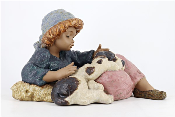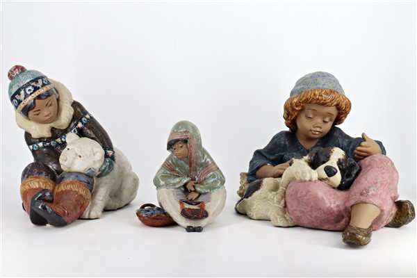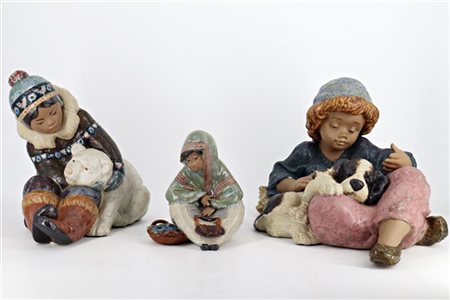 Manifattura Lladrò. Lotto composto da tre gruppi in porcellana policroma raffiguranti fanciulli. Marcati sotto la base (cm max 36x21) (lievi difetti)
