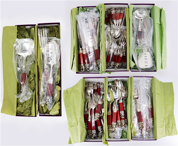 Manifattura Siècle Paris. Parte di servizio di posate in legno e metallo argentato, entro custodie (difetti)