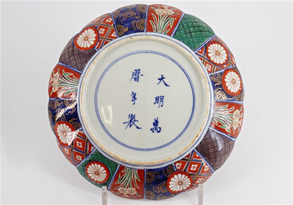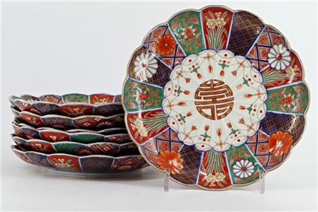 Lotto composto da sette piatti in porcellana policroma polilobati Giappone, sec