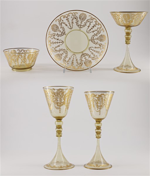 Manifattura di Murano (?). Parte di servizio da tavola in vetro decorato in oro