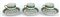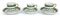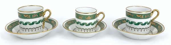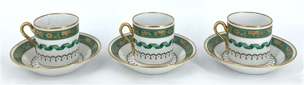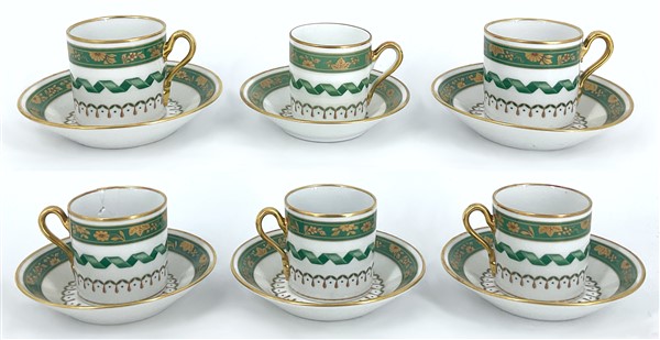 Manifattura Richard Ginori, gruppo di sei tazzine e cinque piattini uniti ad un piattino più piccolo in porcellana con decoro in verde e oro (difetti)