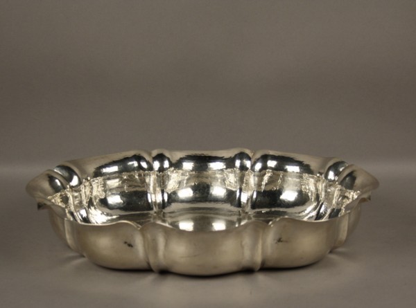 Centrotavola in argento sbalzato martelé, gr. 640 ca. XX secolo. Mis. Lung. cm. 34 Alt. cm. 6 Prof. cm. 27 ca.