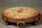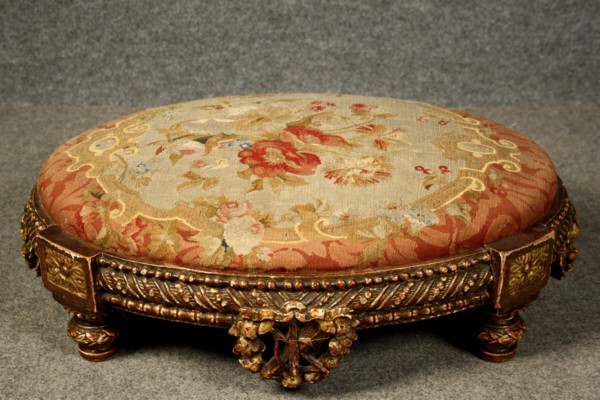 Poggiapiedi in legno intagliato e dorato ricoperto con abousson. XIX secolo....