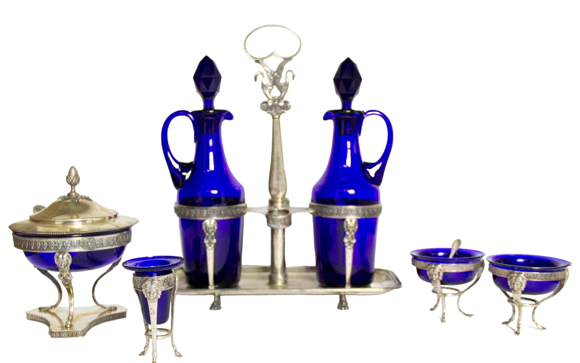 MENAGE 5 PEZZI in argento 800, gr 622, decorato da presa a forma di cigno e tripode con faccia leonina a supporto dei contenitori Milano 1920 circa h cm 30 x 25