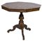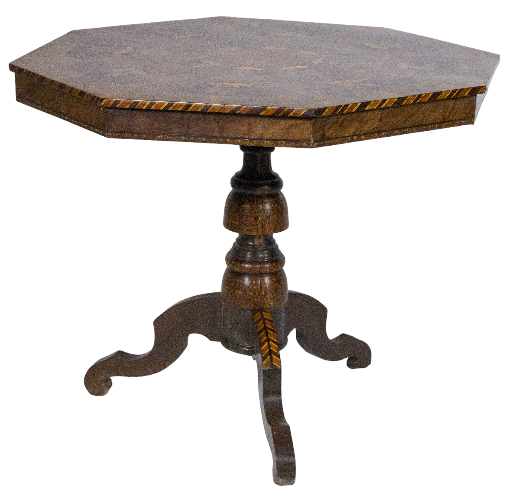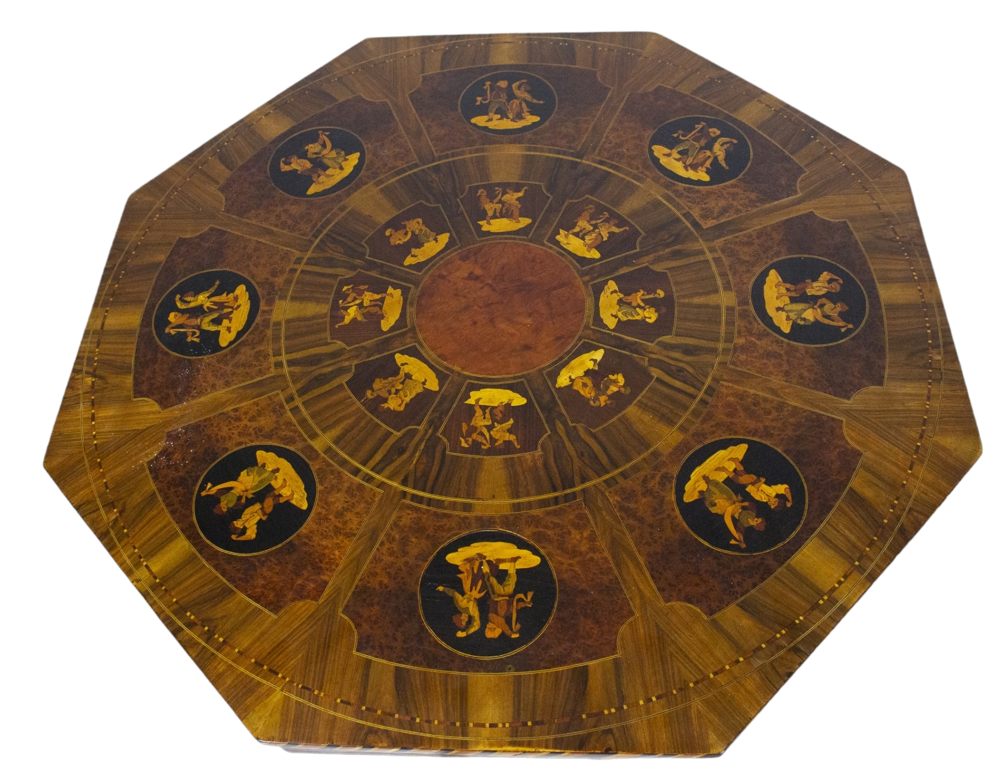 IMPORTANTE TAVOLINO SORRENTINO di forma ottagonale, intarsiato in varie essenze, decorato da tarsie raffiguranti ballerini in costume tradizionale dentro riserve tonde, il centro presenta essenza di legno da frutto Bottega Gargiulo Napoli XIX secolo h cm 75 x Ø 97