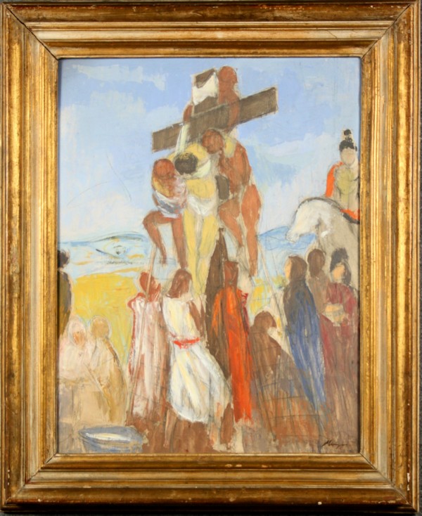 MENZIO FRANCESCO - Nato a Tempio Pausania (Olbia-Tempio) nel 1899. Morto a Torino nel 1979. Partecipa alla Biennale di Venezia nel 1928 e nel 1958 con una personale. Nel 1942 vince il Premio Bergamo. Dipinto olio su compensato raff. ''CROCEFISSIONE''. Firmato in basso a destra. In cornice. Mis. Lung. cm. 51 Alt. cm. 65,5 ca