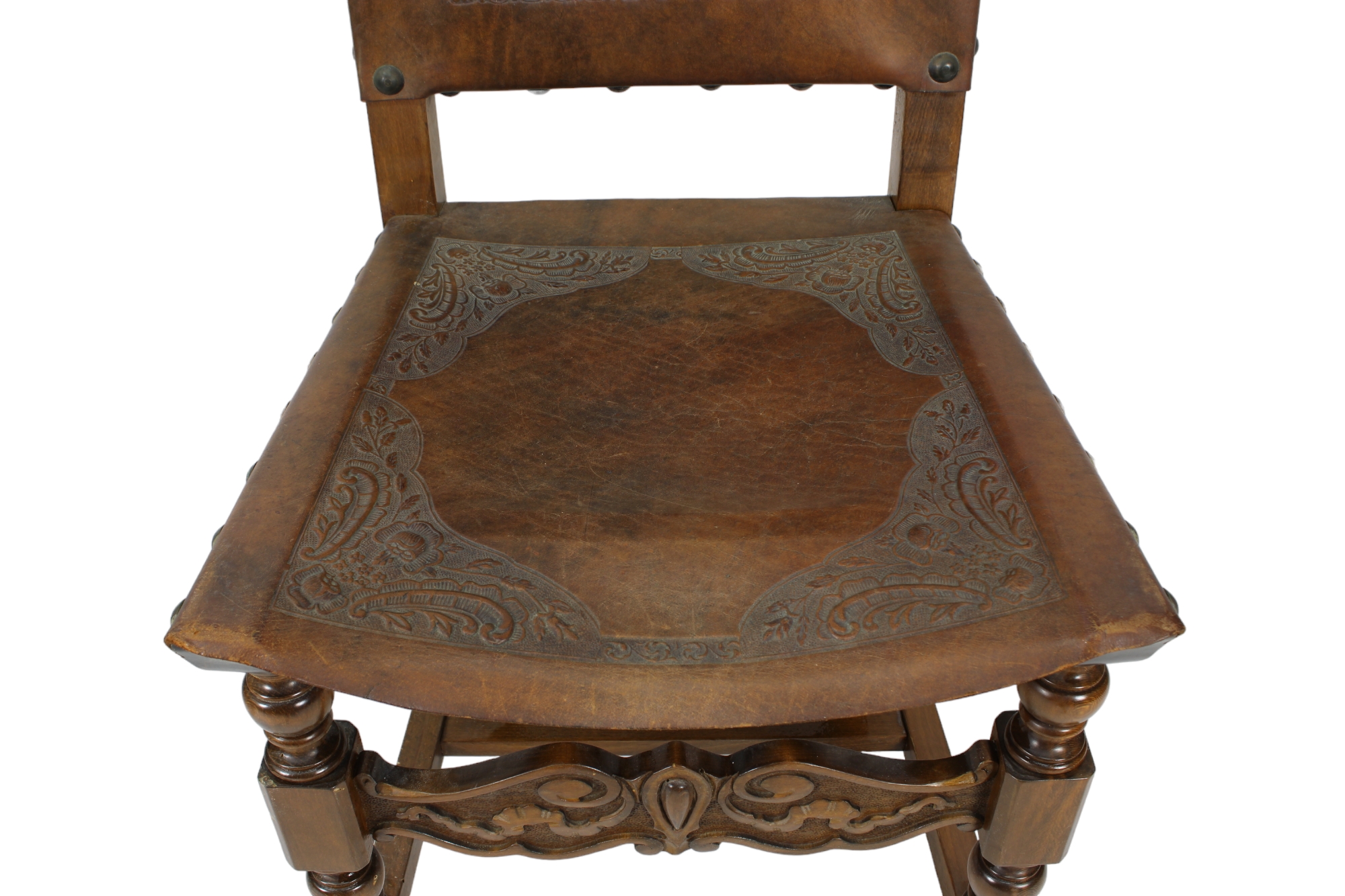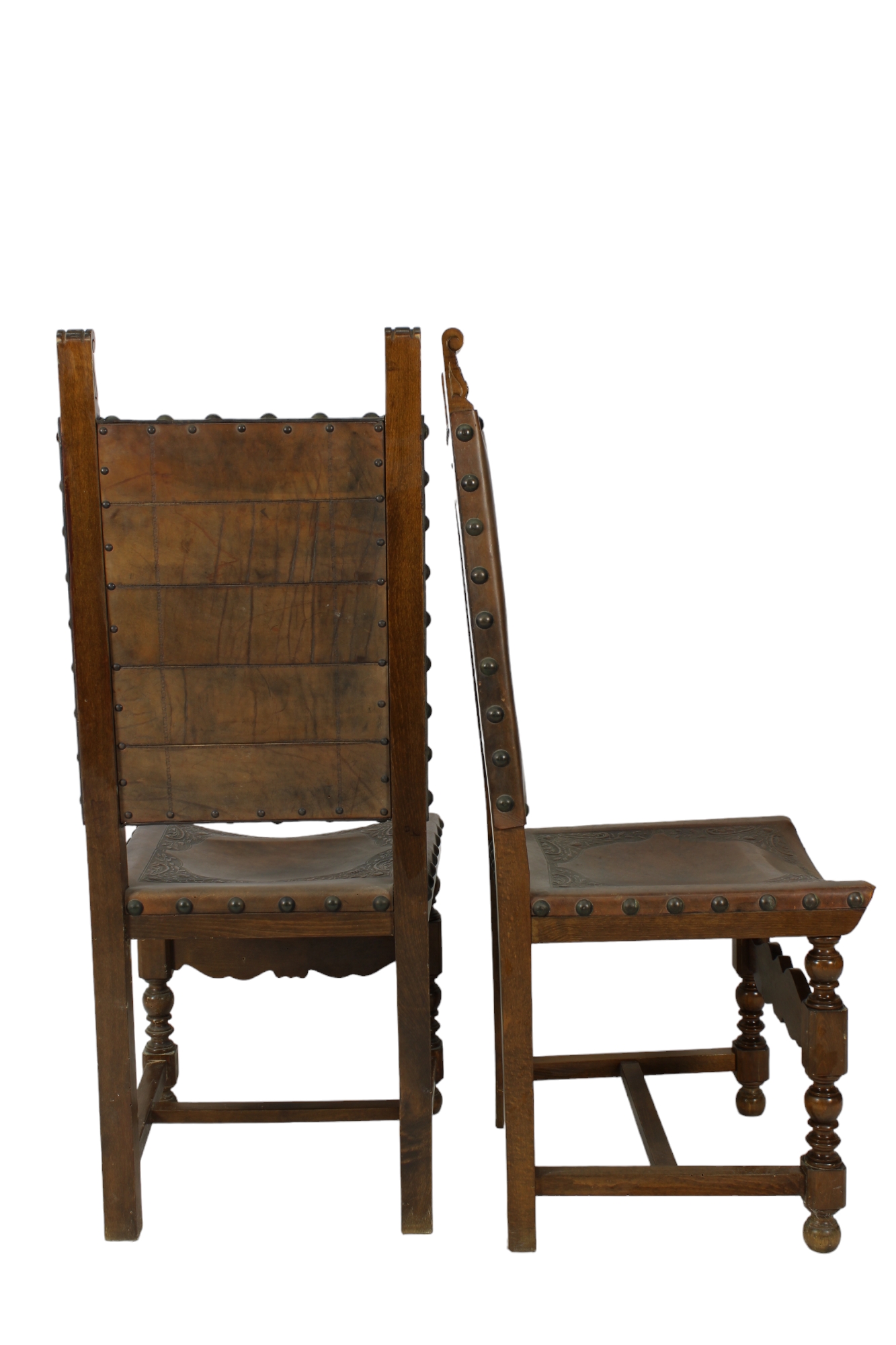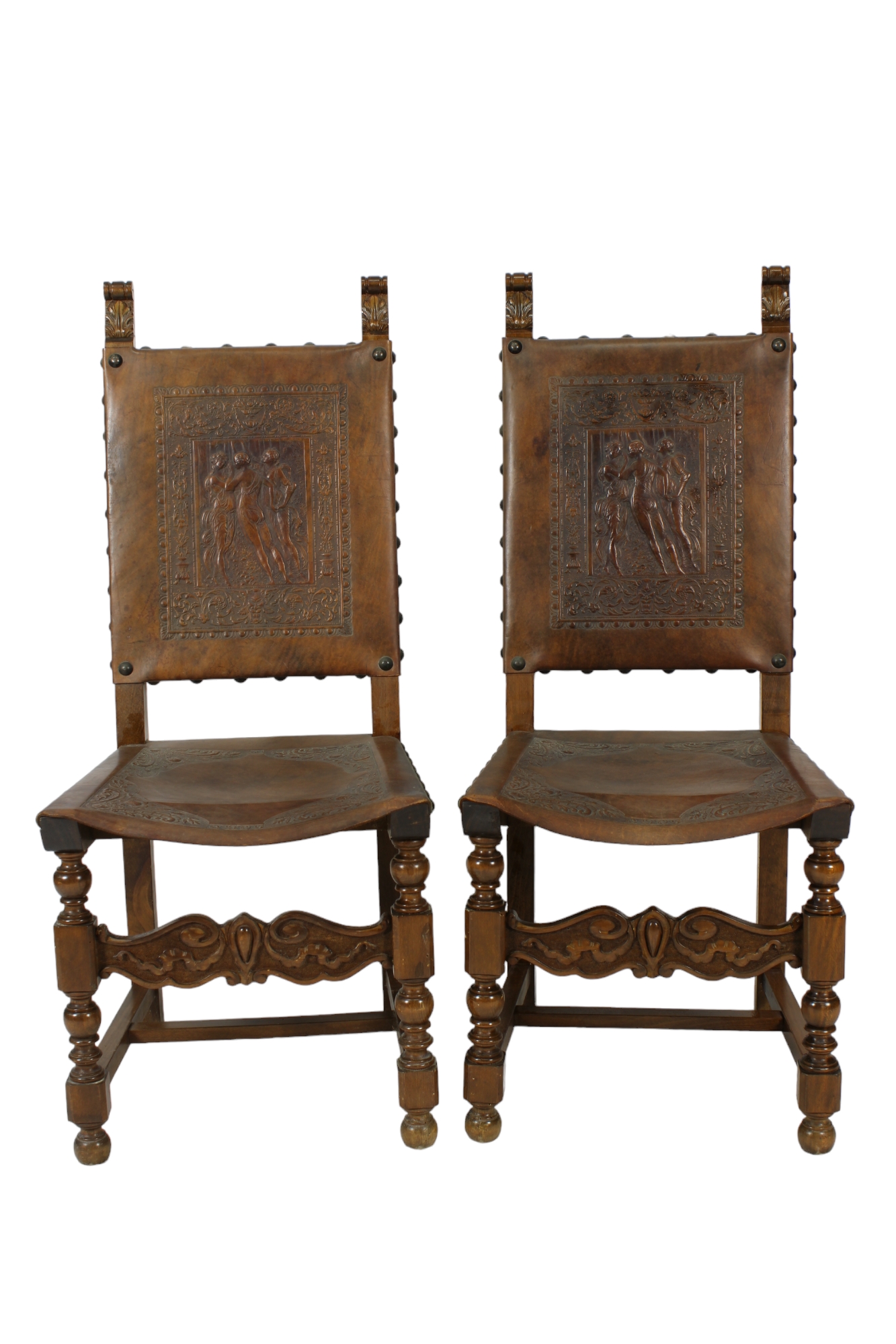 COPPIA DI SEDIE in legno di noce con sedute e spalliera in cuoio stampata a fuoco Sicilia XIX secolo h cm 114 x 47 x 46