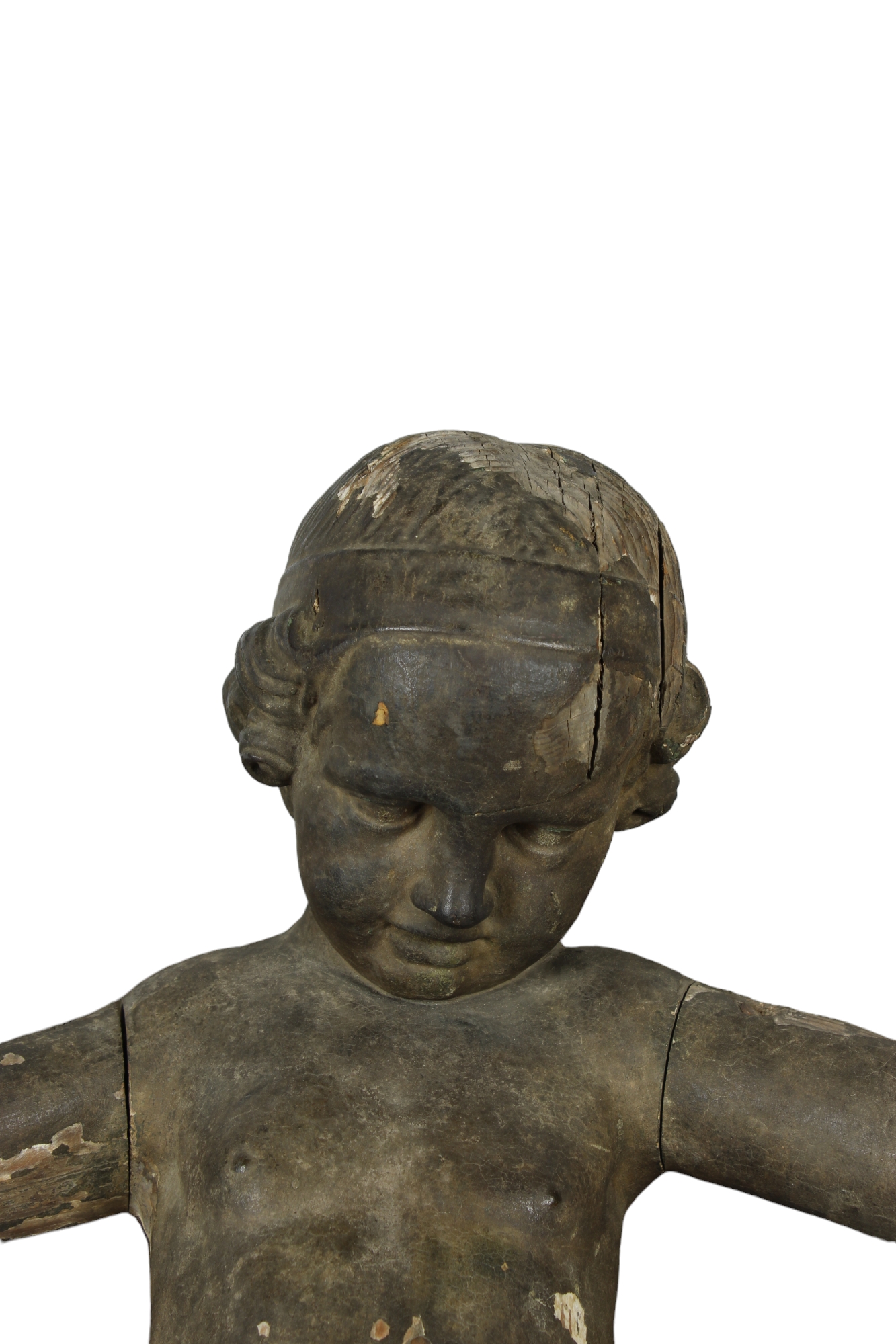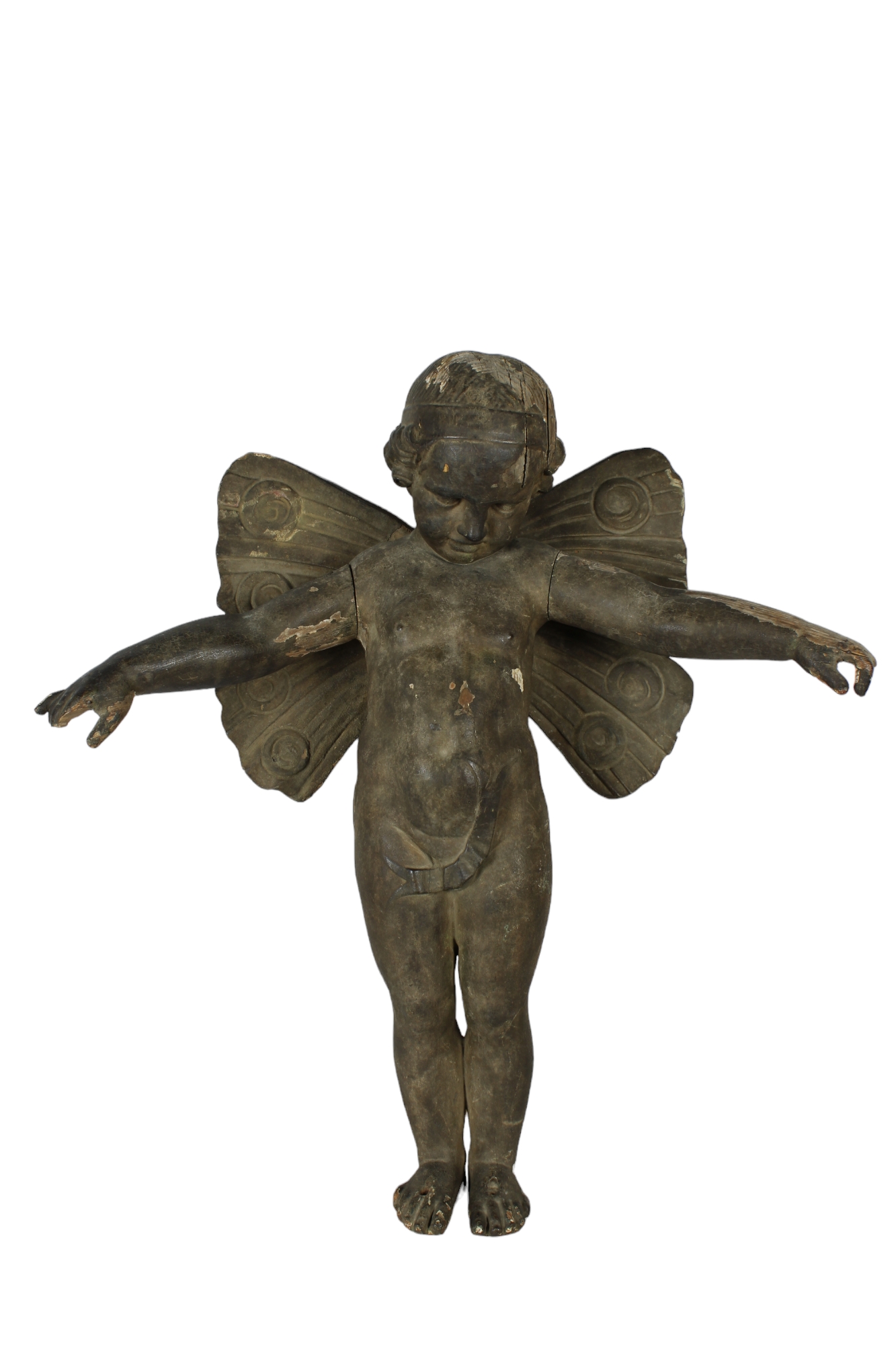 IMPORTANTE SCULTURA in legno finemente scolpito e laccato a finto bronzo probabilmente raffigurante psiche da bambina con ali di farfalla,usure e mancanze maestranze italiane XVII / XVIII secolo h cm 74 x 80 x 21,5