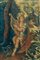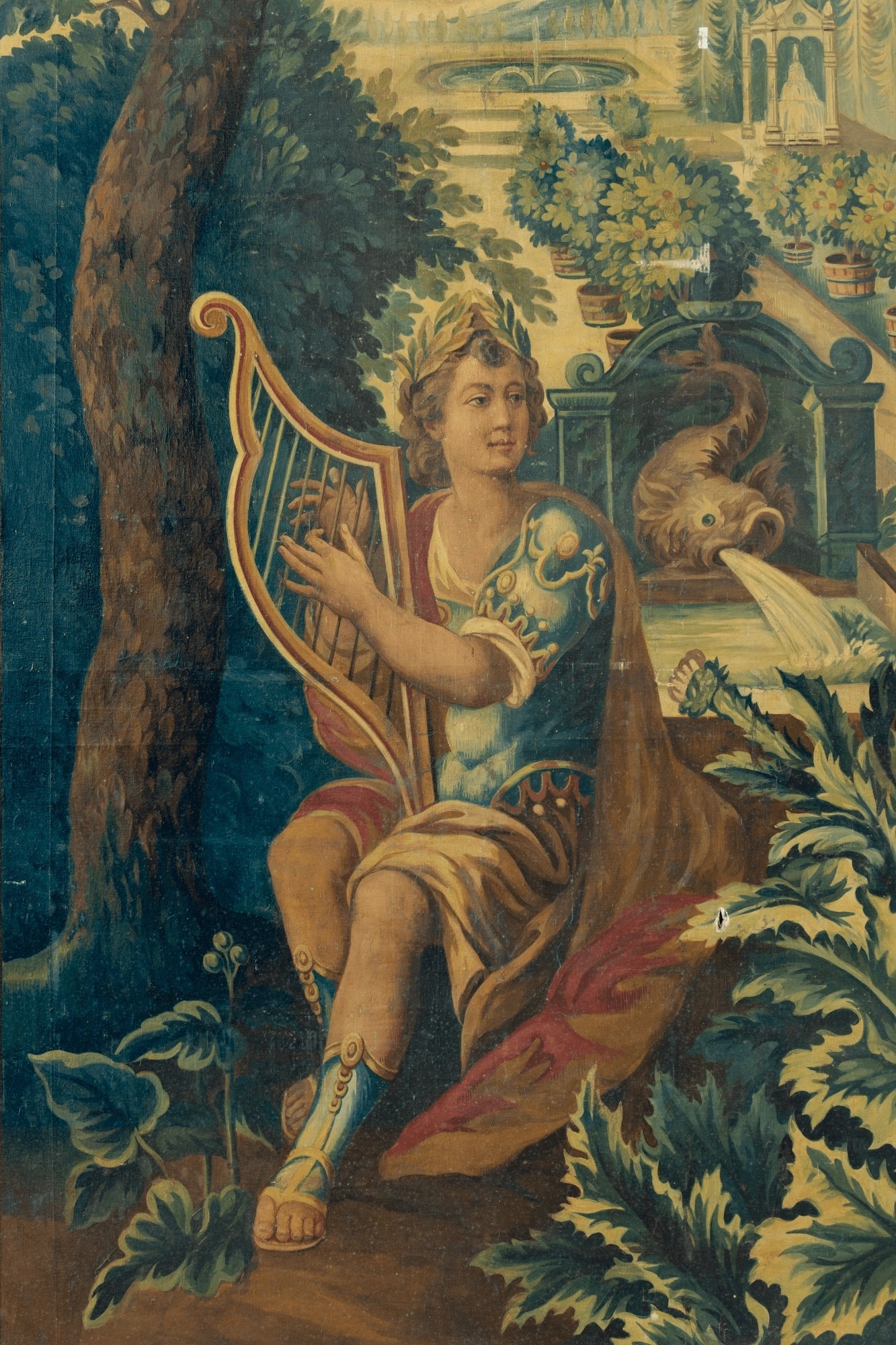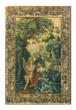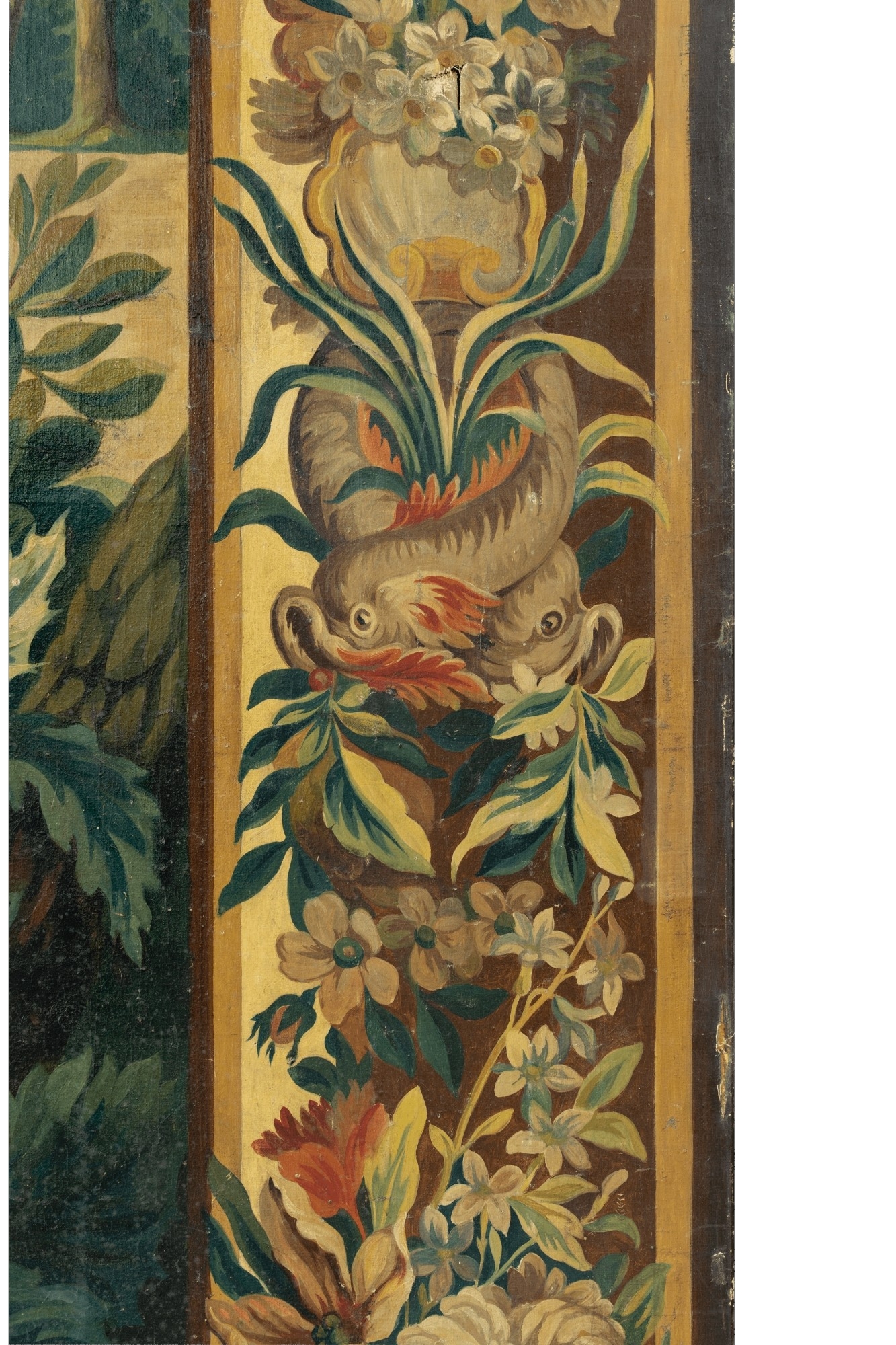 GRANDE DIPINTO con soggetto mitologico raffigurante in primo piano il Dio Apollo con la sua lira in un giardino alla francese probabilmente della reggia di Versailles, il dipinto è incorniciato da larga bordura decorata da vasi e conchiglie da cui fuoriescono trionfi di fiori e frutti intervallati da soggetti zoomorfi Venezia XVIII secolo h cm 275 x 138