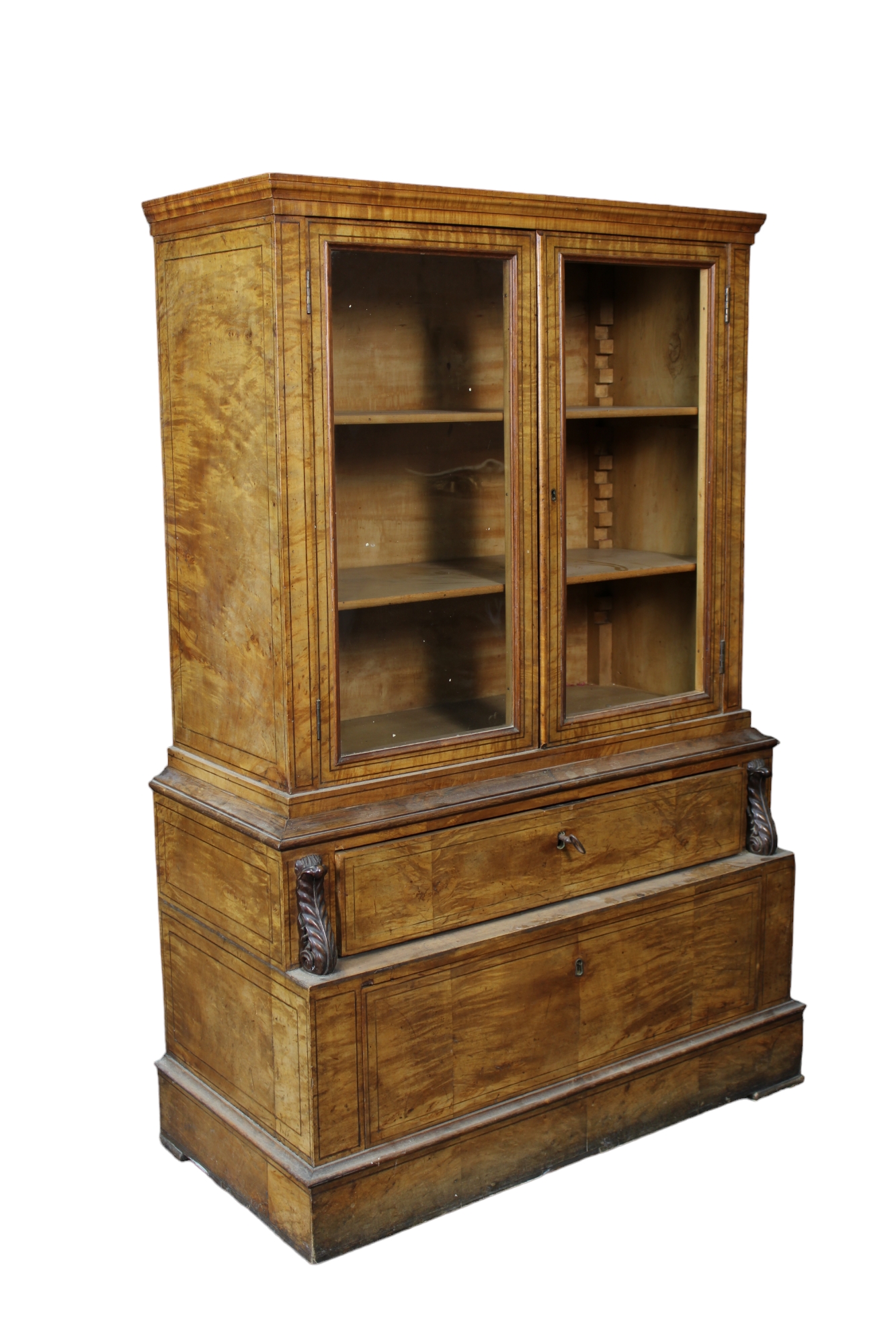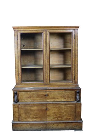 VETRINA CARLO X in legno di acero con perfili in palissandro parte superiore a due sportelli a vetri e parte inferiore due cassetti di misure diverse Sicilia XIX secolo h cm 130 x 88 x 42