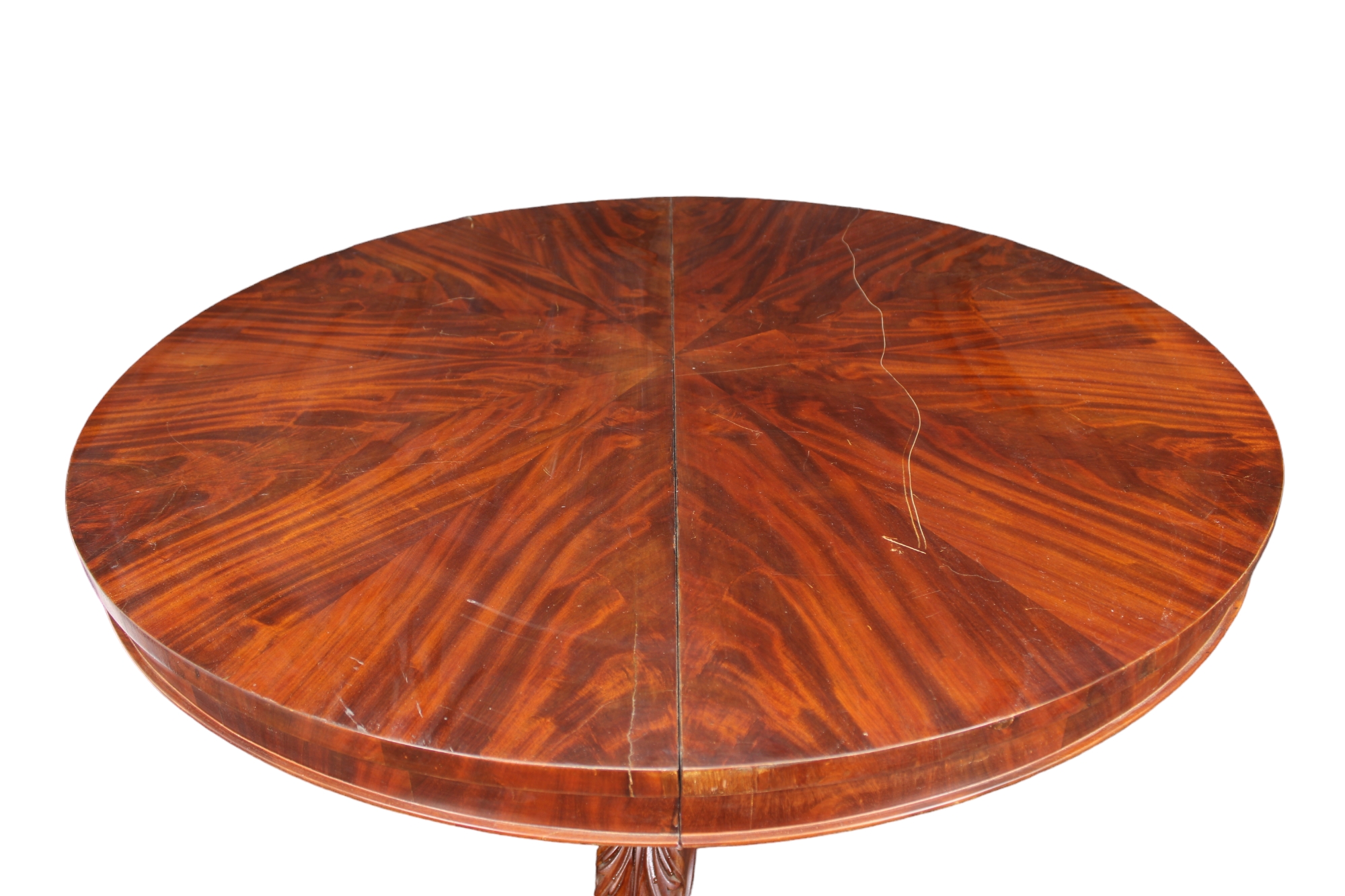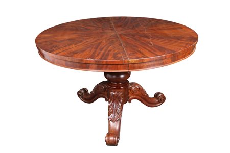 TAVOLO DA CENTRO ALLUNGABILE in mogano e piuma di mogano a piede centrale Francia XIX secolo h cm 79 x Ø 126