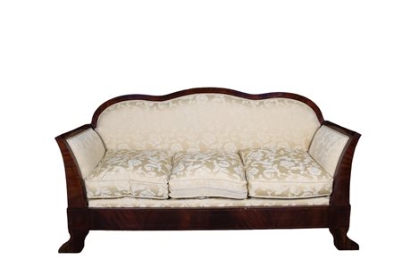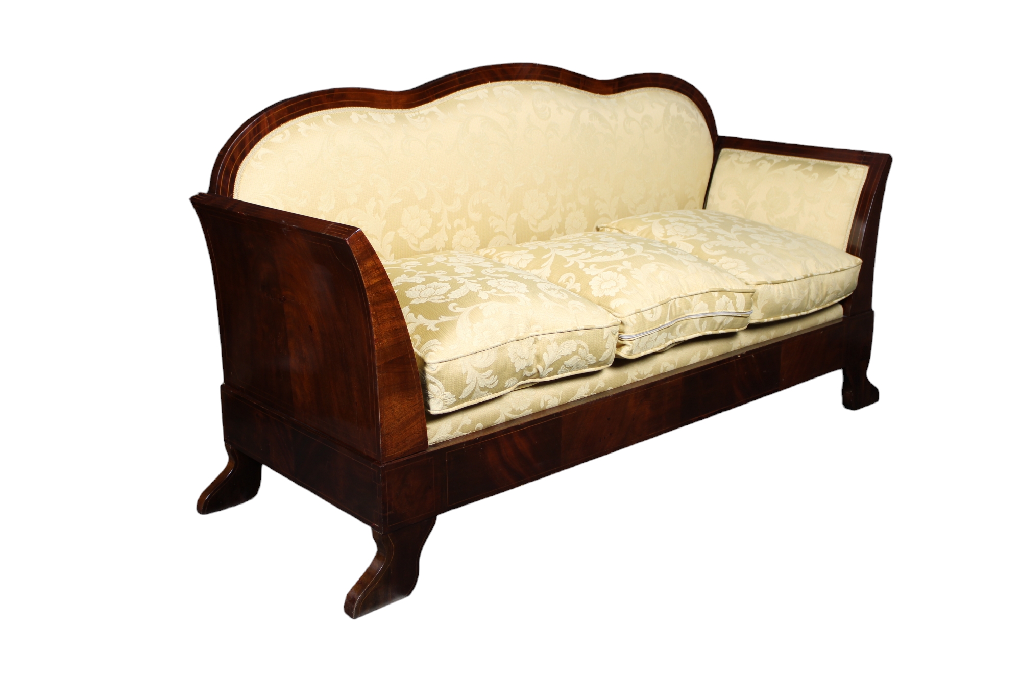 DIVANO CARLO X in legno di mogano con perfili in bosso e imbottitura in tessuto Sicilia XIX secolo h cm 90 x 178 x 60