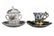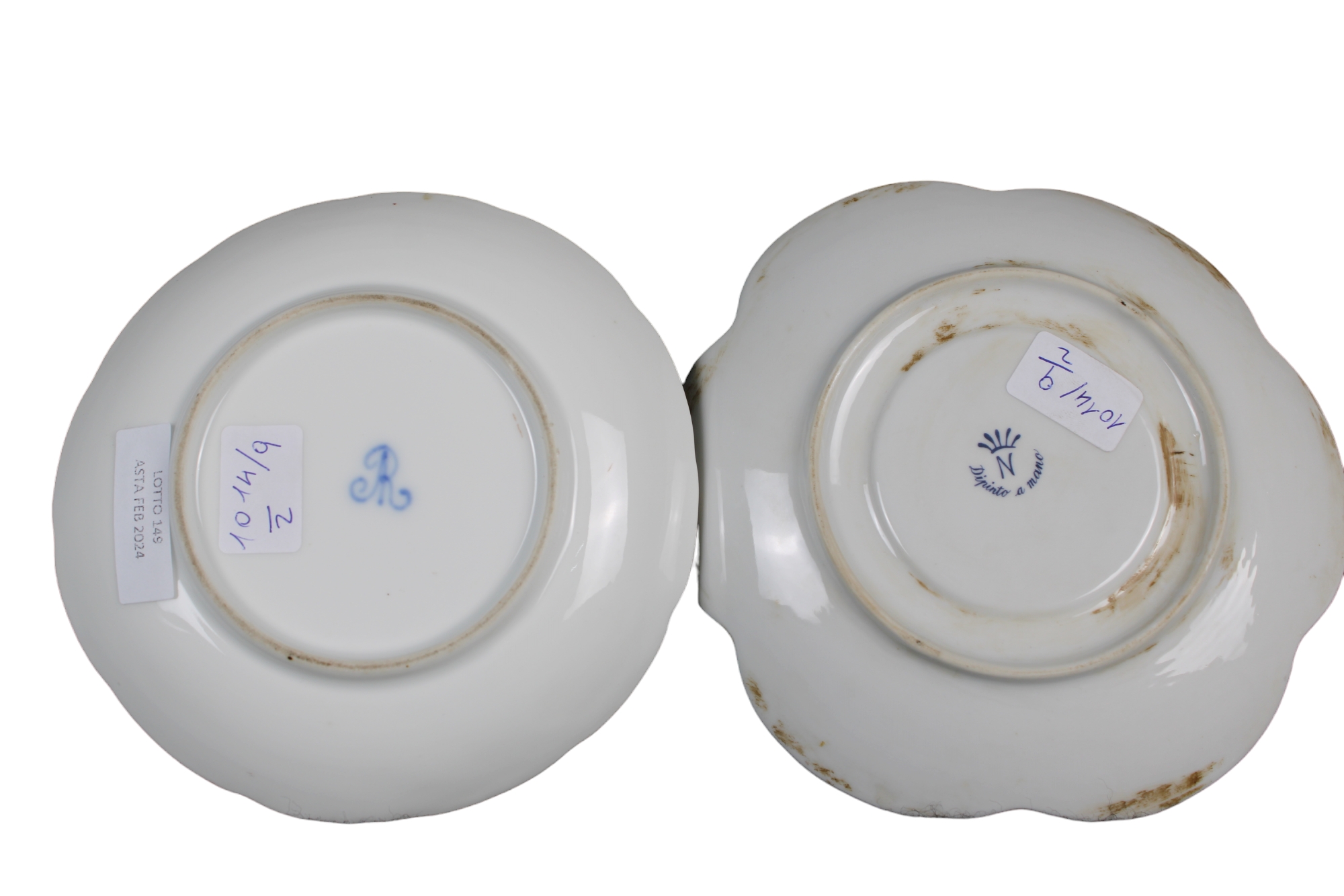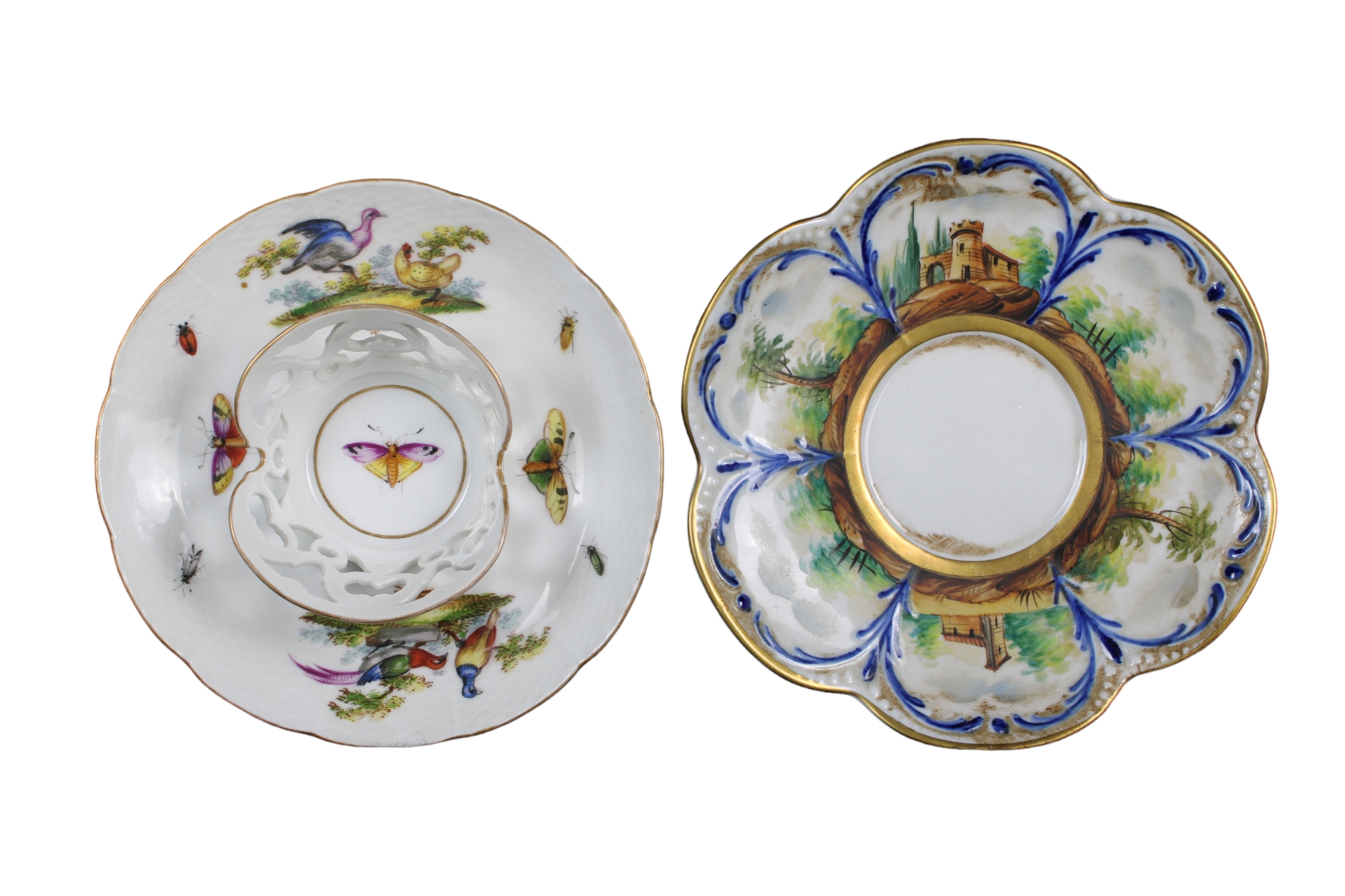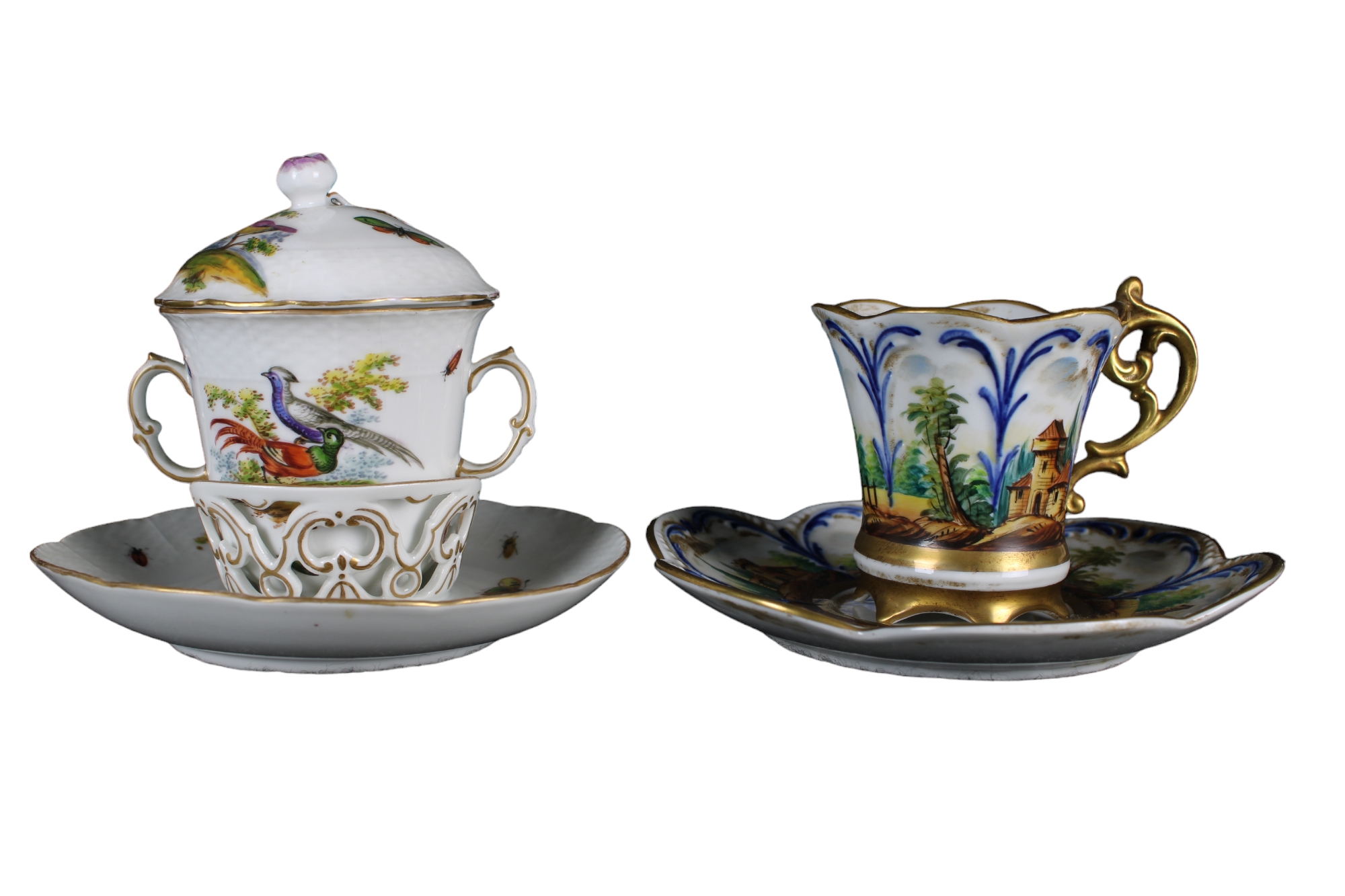 LOTTO COMPOSTO DA 1 tazza da puerpera con piattino e coperchio in porcellana dipinta raffigurante uccelli e insetti con lumeggiature in oro manifattura tedesca XIX Secolo e 1 tazza con piattino in porcellana dipinta a tutto tondo raggigurante paesaggio manifattura Capodimonte Primi 900' misure varie