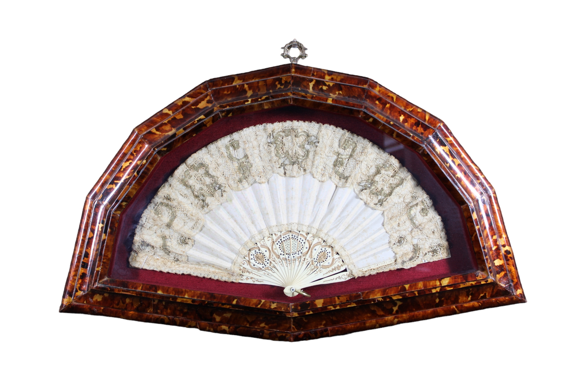 VENTAGLIO in pizzo dentro teca in materiale prezioso manifattura francese XIX/XX Secolo h cm 35 x 59