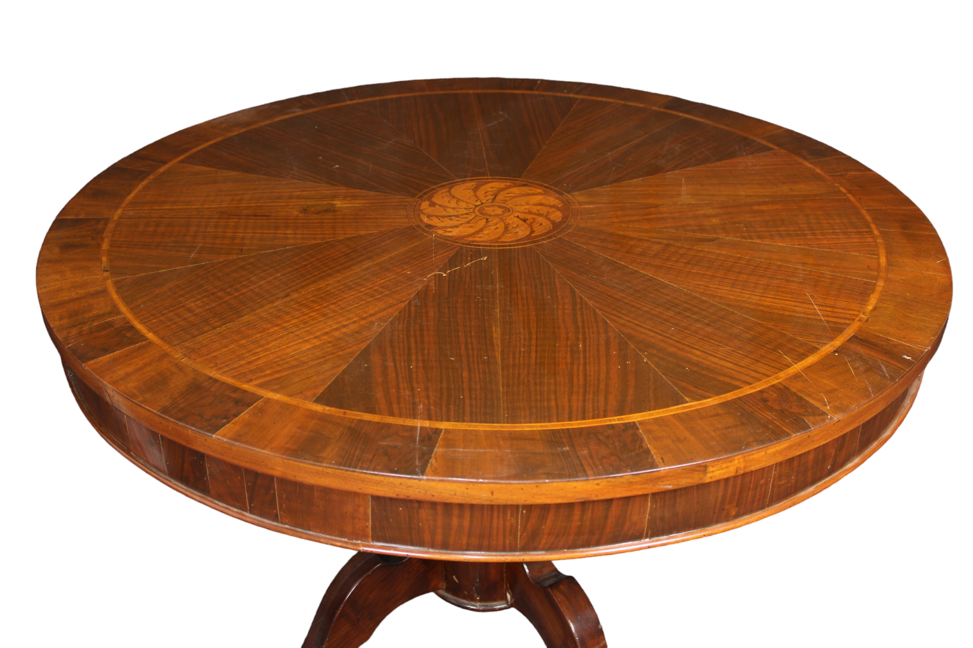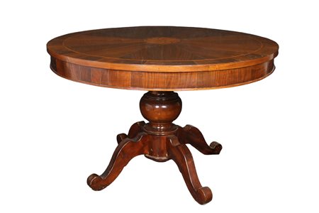 TAVOLO DA CENTRO in legno di noce e intarsiato in varie essenze di legno piede centrale maestranze Emiliane Primi 800 h cm 79 x 125